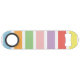 Geometric linear, rectangle, striped pattern of rainbow pastel hues of blue, orange, green, pink, purple, red and yellow.