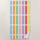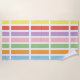 Geometric linear, rectangle, striped pattern of rainbow pastel hues of blue, orange, green, pink, purple, red and yellow.