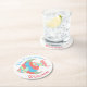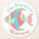 Tropical theme pulp board paper coasters, with graphics of a very colourful patterned fish, on a white background. Personalise the turquoise blue and coral arched text to suit your needs. Great for anytime use and makes a nice gift idea.