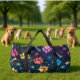 This colourful pattern duffel bag features vibrant paw prints and bones scattered across a dark, space motif background with tiny stars. It's a stylish and functional pet-themed travel accessory, perfect for any pet lover.