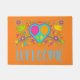 An peace loving hippy style colourful welcome mat featuring colourful heart peace sign with doves illustration against an earthy customisable coloured background with welcome sign. A homely, sixties colourful and arty welcome door mat perfect for your house.
