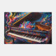 A colourful grand piano with its lid open, surrounded by musical notes, swirls of colour, and a burst of multicolored feathers on top.