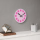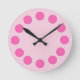 A simple yet interesting minimalistic design based on just one huge dot covering the entire clock face, and a circle of twelve smaller pink dots indicating the hours. There are no digits involved.