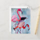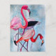 Beautiful colourful watercolor art from original painting by Sacha Grossel of pink and orange flamingos against a sky blue water background. Pretty flamingo art.