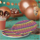 Paper plates featuring a colourful pink, purple, orange and yellow stripes pattern against a centre dark blue background. These plates are great for any celebrations.