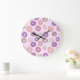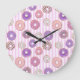 This unique doughnut illustration clock features hand drawn illustrations of pink, white, and purple doughnuts on a pink pastel striped background. It would be cute for a baby's nursery or a girl's bedroom. It would also work in a kitchen or for a bakery.