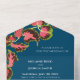 Wedding invitation in blue with colourful plant leaf accents. Customisable meal selection with three options.