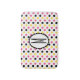 Whimsical colourful bath mat, done in a pink, yellow, and black, on white, polka dot pattern. A black scalloped framed oval text area, in the middle, has a large black one letter monogram ready to personalise. Comes in three sizes.