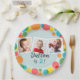 Show off some of your favourite photos with these custom paper plates. They're ready to be customised with three of your photos (square shaped photos work best!) Plus the name and age of your little ray of sunshine. These plates have a light blue background with a border of colourful confetti polka dots in red, orange, yellow, green and blue.