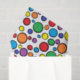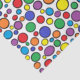 Abstract art of polka dots of different colours outlined in black against a white background.