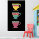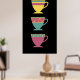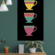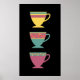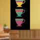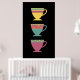 Three retro style colourful, yellow, purple, blue hot cups of tea or coffee. Porcelain mugs in a row.