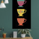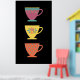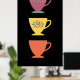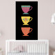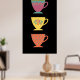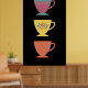 Retro design porcelain tea cups in a row. Three colourful coffee mugs.