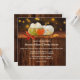 A colourful autumn wedding invitation featuring two pumpkins with fall leaves and bokeh sparkling lights on dark wood. This invitation has a matching RSVP card.