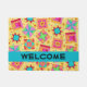 Show your quilt love and welcome guests with this quilt art door mat that's great for home or a quilt business. The word "Welcome" is on a turquoise teal blue strip and can be easily customised to another word or name. This original quilt art combines favourite quilt blocks such as log cabin, stars and pinwheels plus unique blocks to form a quilt design with vibrant and dynamic colours on a warm vibrant yellow background. The block colours are green, yellow, pink, orange, red, and turquoise blue. Small yellow flowers are in the background between the blocks. This makes a great gift for a quilter or quilt lover. Fully customisable for a unique one of a kind door mat. This quilt art is from fabric and quilt designer Phyllis Dobbs.