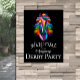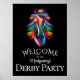 Derby party black Welcome poster features a bright colourful racehorse head and mane and your details in chic lettering. MATCHING items in our collection.