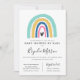 Cute illustrated colourful rainbow, baby shower by mail invitation. Template allows all text to be customised. Back of card features coordinating blue and white stripe pattern.