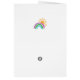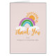 Slightly feminine and nature inspired this folded baby shower thank you note card features a golden sun shining behind a three colour rainbow of bright purple, kelly green, and cyan blue against a background of soft, blush pink. Give to the new parents at the baby shower and make their thank you note sending a little bit easier.