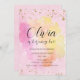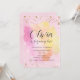 This adorable invitation features a faded watercolor background, with pastel pink, orange and yellow tones, scattered gold glitter, the design is sweet, artistic, elegant and girly.