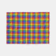 Fleece blanket with a colourful chequered plaid pattern in the colours of the rainbow. A Plaidwerx original pattern.