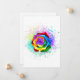 Large, blooming rose with rainbow petals on white background, painted over with splashes of colourful, bright paint. 3d