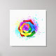 Large, blooming rose with rainbow petals on white background, painted over with splashes of colourful, bright paint. 3d