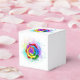 Large, blooming rose with rainbow petals on white background, painted over with splashes of colourful, bright paint. 3d