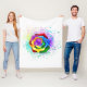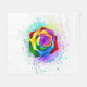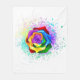Large, blooming rose with rainbow petals on white background, painted over with splashes of colourful, bright paint. 3d