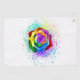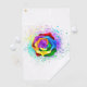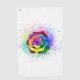 Large, blooming rose with rainbow petals on white background, painted over with splashes of colourful, bright paint. 3d