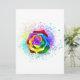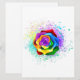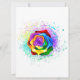 Large, blooming rose with rainbow petals on white background, painted over with splashes of colourful, bright paint. 3d