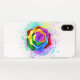 Large, blooming rose with rainbow petals on white background, painted over with splashes of colourful, bright paint. 3d