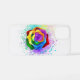 Large, blooming rose with rainbow petals on white background, painted over with splashes of colourful, bright paint. 3d