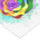 Large, blooming rose with rainbow petals on white background, painted over with splashes of colourful, bright paint. 3d