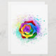 Large, blooming rose with rainbow petals on white background, painted over with splashes of colourful, bright paint. 3d