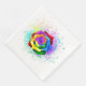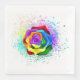 Large, blooming rose with rainbow petals on white background, painted over with splashes of colourful, bright paint. 3d