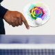 Large, blooming rose with rainbow petals on white background, painted over with splashes of colourful, bright paint. 3d