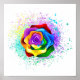 Large, blooming rose with rainbow petals on white background, painted over with splashes of colourful, bright paint. 3d