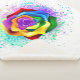 Large, blooming rose with rainbow petals on white background, painted over with splashes of colourful, bright paint. 3d