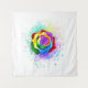 Large, blooming rose with rainbow petals on white background, painted over with splashes of colourful, bright paint. 3d