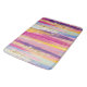 A bath mat with an abstract background design. Vibrant stripes in both bold and pastel colours. Pinks, blues, purples and yellow colours combined with faux gold sparkly glitter layered over top.