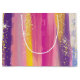 A gift bag with an abstract background design. Vibrant stripes in both bold and pastel colours. Pinks, blues, purples and yellow colours combined with faux gold sparkly glitter layered over top.