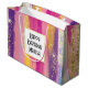 A gift bag with an abstract background design. Vibrant stripes in both bold and pastel colours. Pinks, blues, purples and yellow colours combined with faux gold sparkly glitter layered over top.