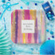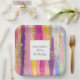 Paper plates with an abstract background design. Vibrant stripes in both bold and pastel colours. Pinks, blues, purples and yellow colours combined with faux gold sparkly glitter layered over top.