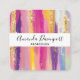 Business cards with an abstract background design. Vibrant stripes in both bold and pastel colours. Pinks, blues, purples and yellow colours combined with faux gold sparkly glitter layered over top.