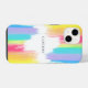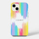Beautiful rainbow watercolor iPhone 14 case with pretty, artistic paint strokes full of bright colour. This colourful, personalised phone case gift features your name or monogram in elegant cursive script under a rain of paint dripping down. Cheerful and fun custom gift for an LGBTQ friend.