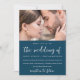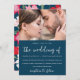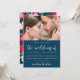 Beautiful illustrated floral photo wedding invitation. This colourful invitation is a chic way to let invited guests know of your upcoming marriage ceremony. This gorgeous announcement features lovely "the wedding of" calligraphy script on a vibrant blue background with the couple's photo, and a red pink and white floral pattern back of the card.
