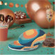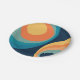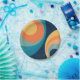 Abstract illustration of colourful retro style circles in yellow, blue, orange and turquoise colours on navy blue background