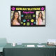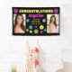 Fun retro hippie-style graduation party banner with colourful pink, teal, green, and yellow flowers on a black background along with 2 of your favourite photos.