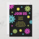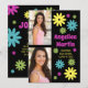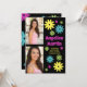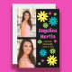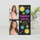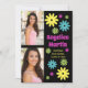 Fun retro hippie-style graduation party invitation with colourful pink, teal, green, and yellow flowers on a black background along with 2 of your favourite photos. This card is designed on both front and back. The front of the card has your photos, graduate's name, school name, graduation year, and the back has your party information.