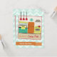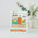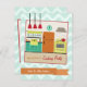 A cooking party invitation featuring an illustration on front of a retro inspired kitchen decorated with a turquoise, yellow, red, and orange colour scheme. Personalise the text on front and back. Background is light blue with zig zags.