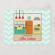 A recipe postcard featuring an illustration of a retro inspired kitchen decorated with a red, turquoise, yellow, and orange colour scheme. Personalise the text with your name. Background is light blue with zig zags. Opposite side is blank.